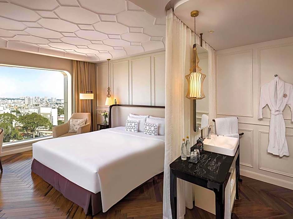 This room is located between the 18th and 22nd floor. Showcasing a chic, modern Indochine design, this twin room features natural wooden flooring and exquisite furnishings designed by Vietnamese artisans. Enjoy breathtaking city views through the large floor-to-ceiling window. The elegant private bathroom is equipped with a rain shower alongside our signature amenities. Nonsmoking room.